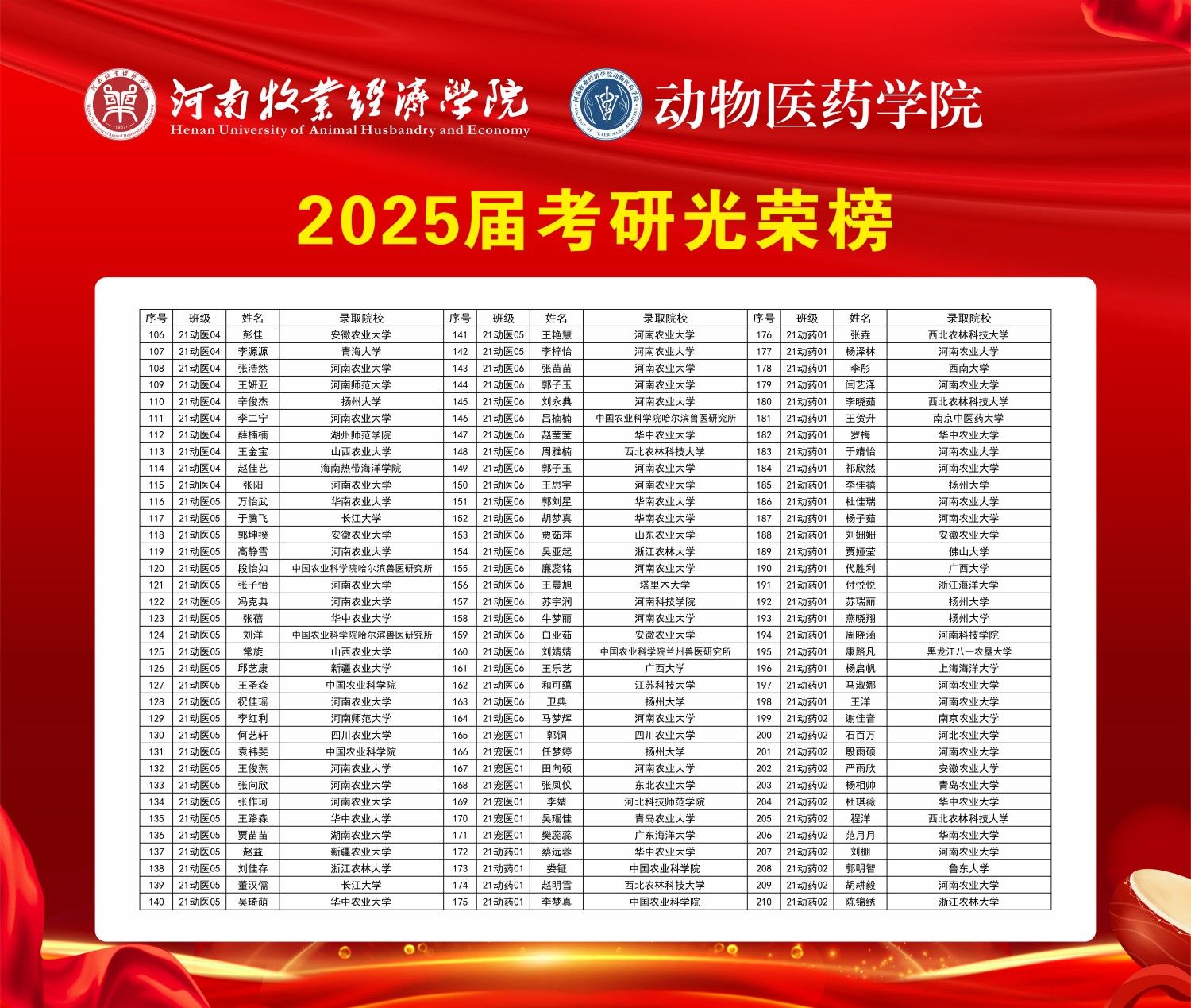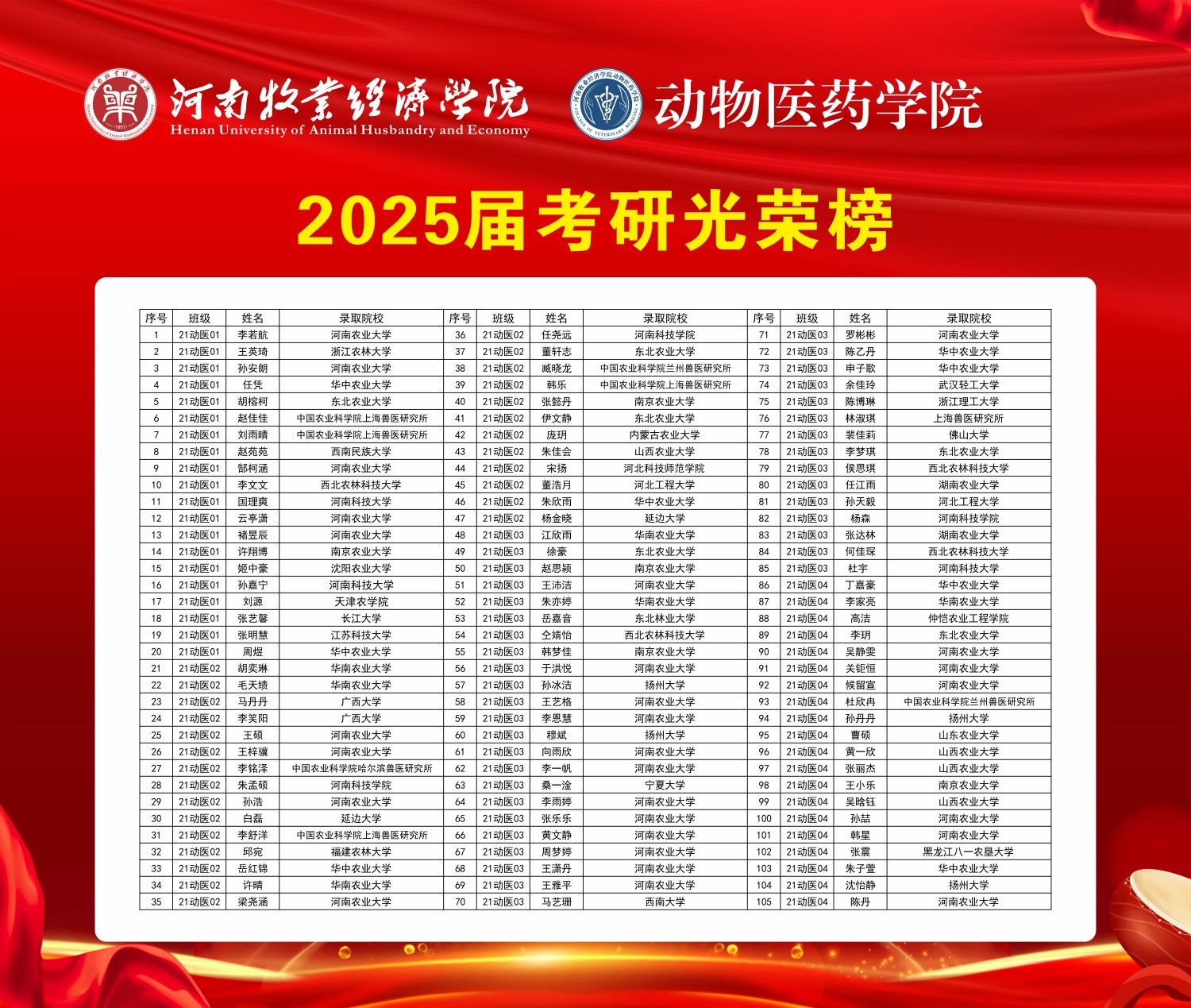 近日,2025年全国硕士研究生招生录取工作落下帷幕,太阳集团tyc59972025届毕业生考研录取率达42.55%,再创新高!被录取的314名学生中,93名学生被中国农业科学院等知名科研院所以及华中农业大学、西北农林科技大学、华南农业大学、南京农业大学、郑州大学、广西大学等“985”“211”“双一流”高校录取。值得一提的是,21动医03班63人,录取38人,考研录取率高达60.3%;21动医04班60人,录取30人,考研率达50%,该班还喜现一个“学霸宿舍”14号楼407,宿舍六人分别被华中农业大学、扬州大学、河南农业大学、河南师范大学、安徽农业大学等高校录取。