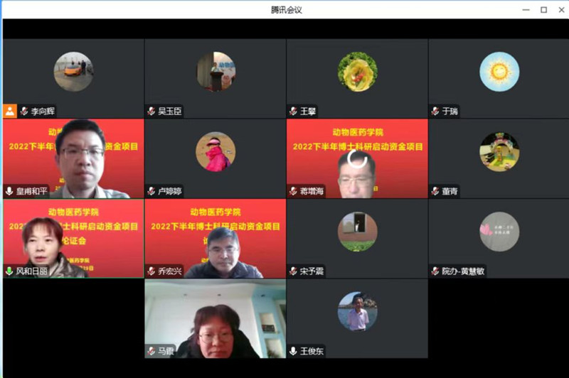 2022年12月29日下午,太阳集团tyc5997以线上腾讯会议的方式举行了博士科研启动资金项目评审会,此次会议邀请了我院特聘教授王俊东,校发展规划处副处长皇甫和平,院长宋予震,科研副院长李利红,兽医学科方向负责人乔宏兴、马霞担任评委。吴玉臣、卢婷婷、李向辉等8位博士作为汇报人参加了此次项目评审会。